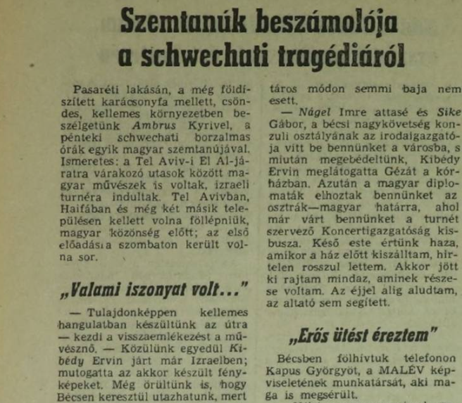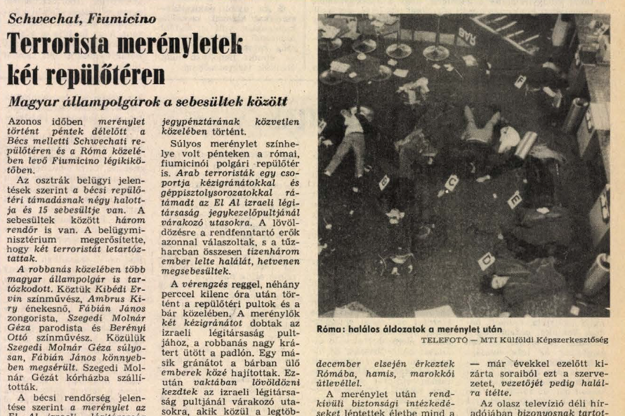 Kapus György, a MALÉV bécsi irodájának munkatársa aznap különleges feladatot kapott: VIP-vendégeket kellett kísérnie a Bécsi Nemzetközi Repülőtéren, amit a magyarok inkább schwechati reptérként ismernek. 1985. december 27-e volt, magyar művészek indultak egy rövid turnéra Izraelbe. Kibédi Ervin színművész, Ambrus Kyri énekesnő, Szegedi Molnár Géza parodista, Fábián János zongorista és Berényi Ottó színész lépett volna fel Tel Avivban, Haifában és még két másik városban ottani magyarok előtt. Budapestről MALÉV-kisbusszal mentek a Bécs melletti reptérig, onnan indultak volna tovább repülővel.