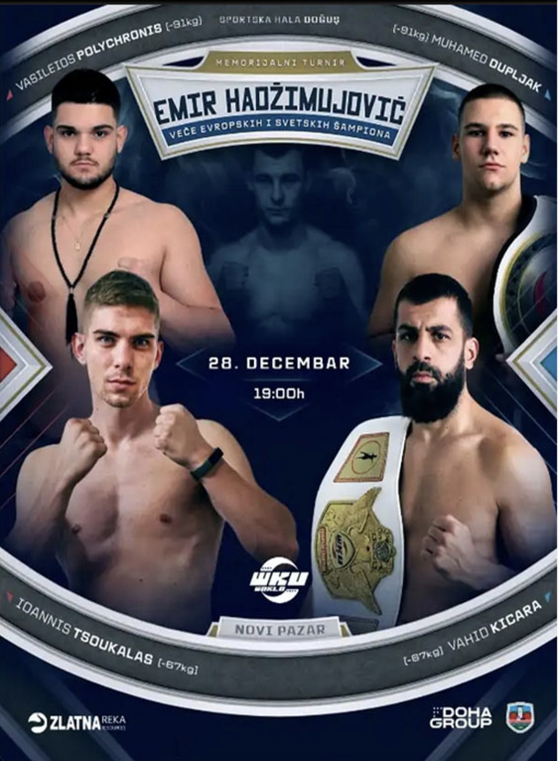 Hogyan lehetne jobban kidomborítani a kölcsönös tisztelet húsbavágó fontosságát, mint egy jó kis tömegverekedéssel? Ez járhatott a dél-szerbiai Novi Pazar sportcsarnokába vasárnap ellátogató nézők fejében, miközben a helyi menő, Vahid Kicara meccsét figyelték görög ellenfelével szemben az Emir Hadzimujovicról elnevezett kick box-emlékgálán. Az alanti plakáton bal alul látható a görög Tsoukalas, vele szemben Novi Pazar szakállas kisbikája, Kicara: