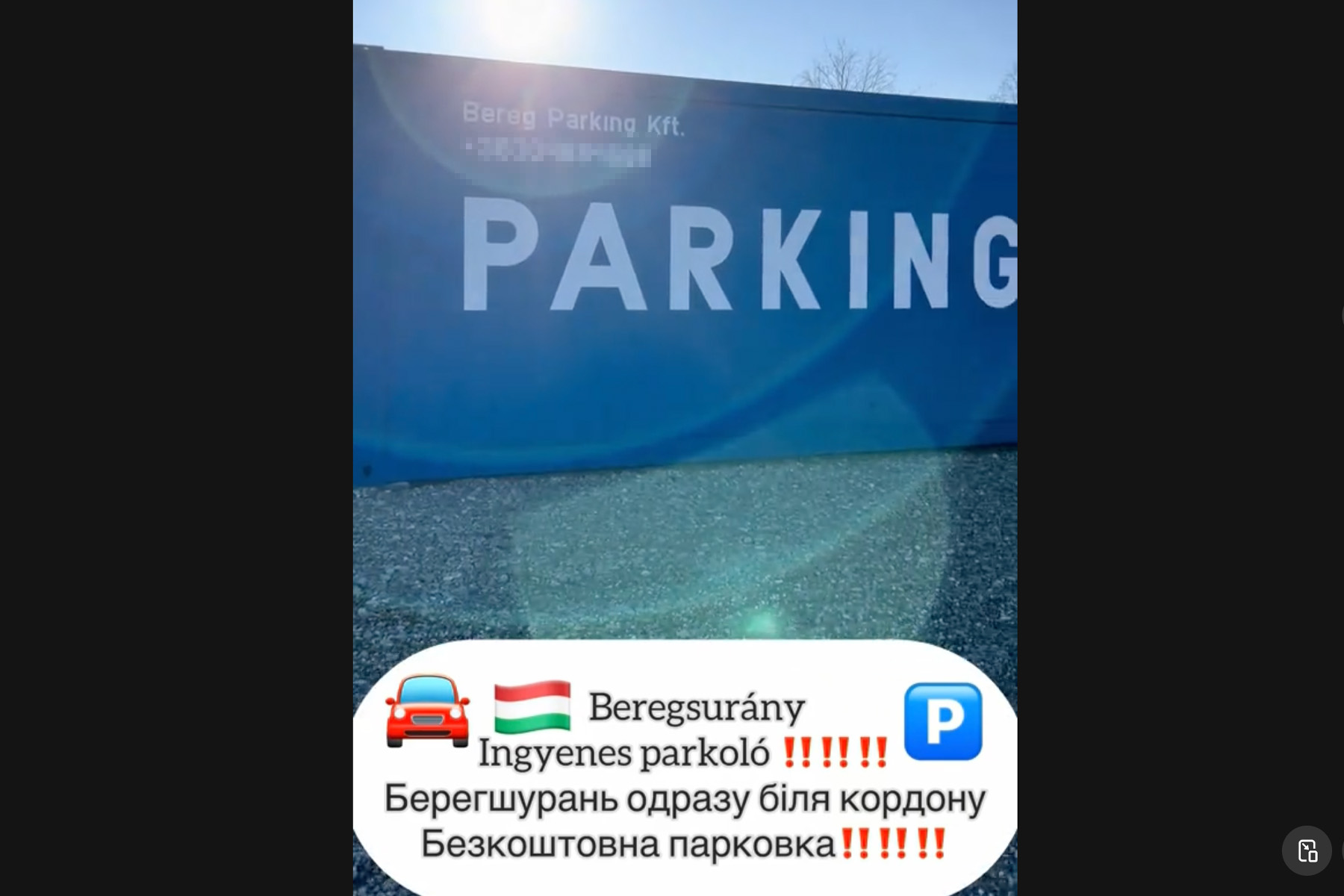 A videóban arról van szó, hogy az ingázóknak tökéletes helyen (a háború ellenére manapság is sokan járnak át – főleg nők – dolgozni Magyarországra), a határátkelő mellett 300 férőhelyes ingyenes parkoló várja hétfőtől azokat, akik autójukat a magyar oldalon hagynák. A felvételen feltűnik egy konténer, rajta egy cégnév: BeregParking Kft.