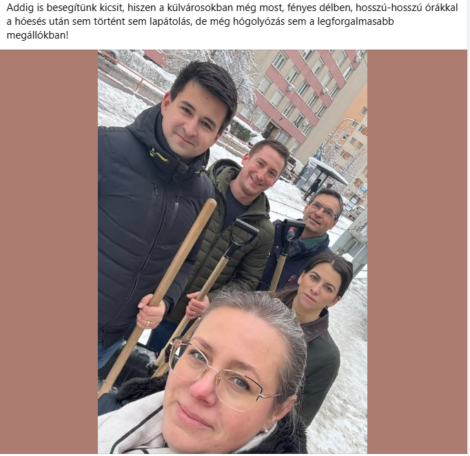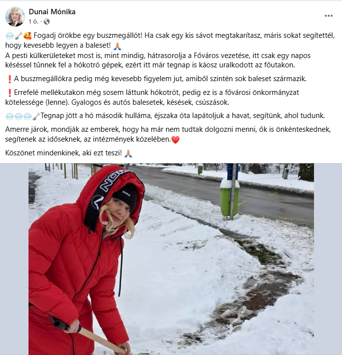 Ugyanígy tett Dunai Mónika, a Fidesz egyetlen egyéniben győztes budapesti országgyűlési képviselője is, aki egyenesen arra buzdított, hogy aki tud, fogadjon örökbe egy buszmegállót, és lapátolja ott a havat.