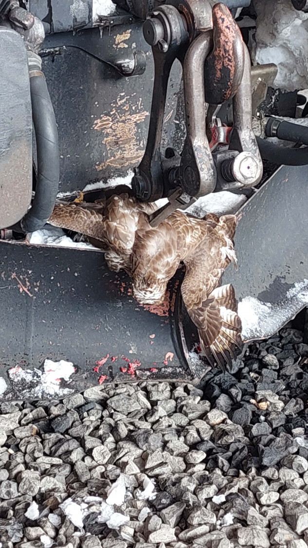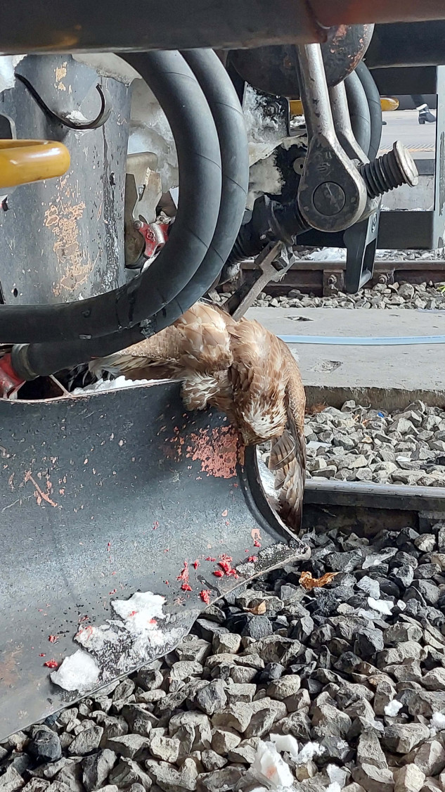Igen, jókora ragadozó madárnak, akit szegényt elkapott a mozdony hóekéje. Talán annyira elmélyülten falatozott egy előző járat által elcsapott állatból, hogy meg sem hallotta, hogy vonat közelít.