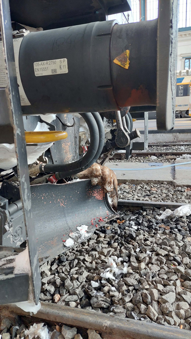 Ritka, bizarr és vad látványban lehetett része a Nyugati pályaudvar utasainak: jókora ragadozómadár-döggel az orrán érkezett meg egy szerelvény a központi csarnokba.