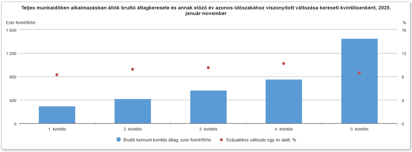 A KSH azt is közölte, hogy jövedelmi ötödönként hogyan alakultak a bérek, illetve a keresetnövekedések a tavalyi első tizenegy hónapban az egy évvel korábbihoz képest. A legfelső jövedelmi ötödbe tartozók bruttó keresete átlagosan 1 451 000 forint volt, az egy évvel korábbinál 8,6 százalékkal nagyobb. A legrosszabbul keresőket leszámítva arányaiban nagyobbat, összegszerűen viszont kisebbet nőttek a fizetések a többi jövedelmi kvintilisben: a legjobban keresők mögötti csoportban átlag 77 ezres, a legjobban keresőknél 125 ezres volt a havi bruttó emelkedése.