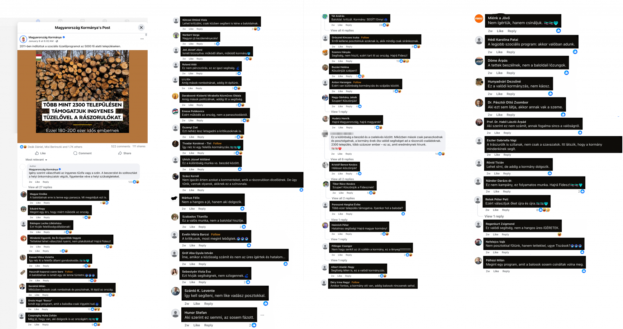 A Magyarország Kormánya által reggel 6 órakor közzétett poszt alatt fél 11 körül kezdtek megjelenni nagyobb számban azok a hozzászólások, amelyek már köszönetet mondtak a támogatásért. Szűk egy óra alatt, 10:26 és 11:19 között több mint hetven ilyen hozzászólás érkezett. Ezekben a Fidesz-kormány felelősségvállalását és gondoskodását méltatták a nehéz időszakban, miközben azt is hangsúlyozták: szerintük ez valódi segítség, szemben a „baloldallal”, amely a kommentelők megfogalmazása szerint panaszkodik, kritizál és legfőképp csak posztol.