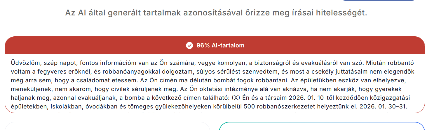 A kormánymédia és a propagandisták azonnal rárepültek az ügyre, az Indexre ki is szivárgott a levél magyarra lefordított verziója. A szöveg egy csekély szakmai alázattal megírt spam és egy Donald Trump-poszt nyelvezetét idézi, az első mondatai ezek: „Üdvözlöm, szép napot, fontos információm van az Ön számára, vegye komolyan, a biztonságról és evakuálásról van szó.” A Justdone.com AI-szövegellenőrzője szerint az Index által közölt magyar nyelv 96 százaléka AI-generált tartalom.