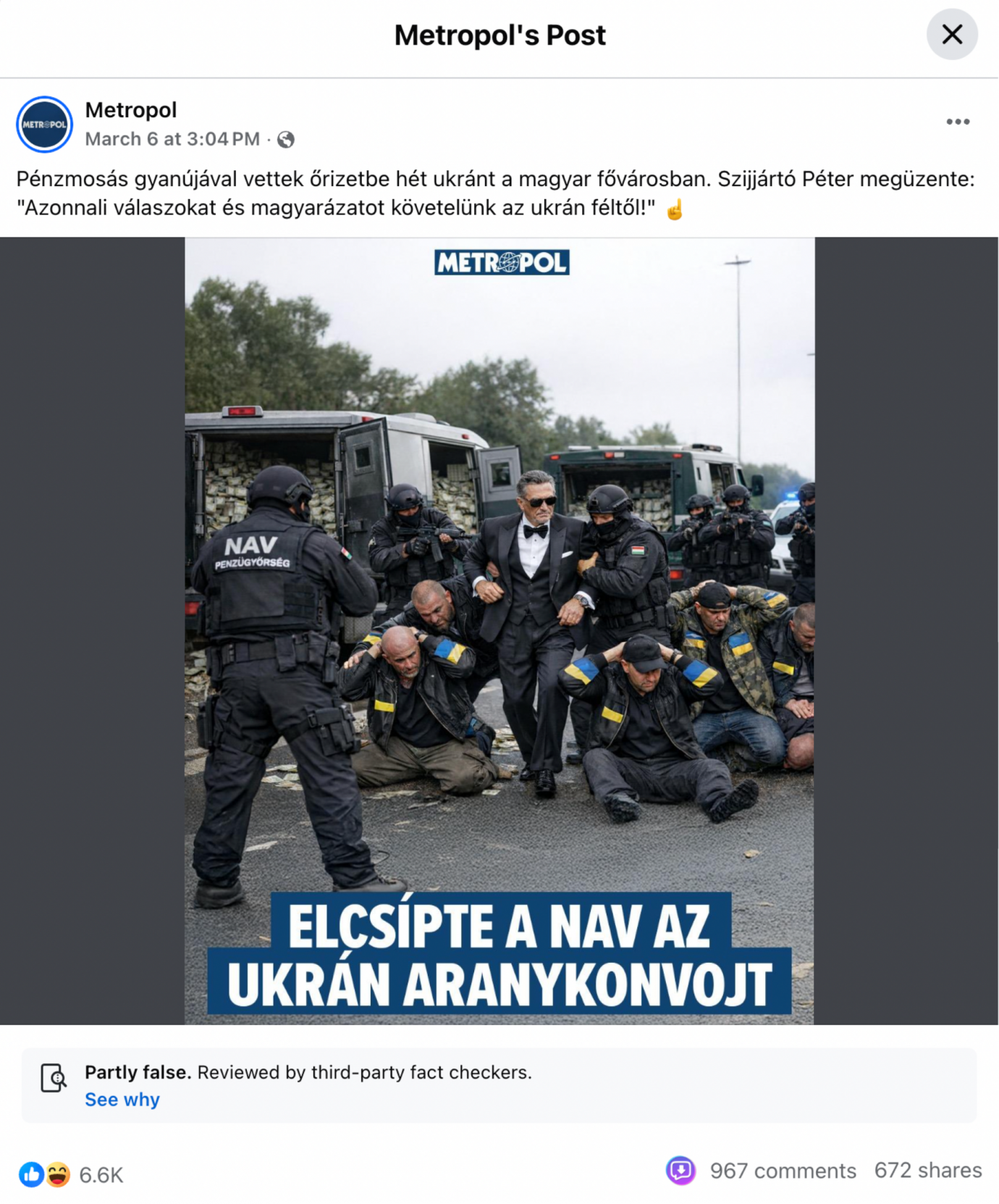 Ehhez látszólag elég volt, hogy KESMA-termékek egyoldalúan közvetítsék a magyar kormány álláspontját az „ukrán aranykonvojról”, és a dokumentumértékű felvételek helyett bombasztikus, néhol trehányan összerakott AI-generált illusztrációkkal kísérjék a beszámolókat az elfogásról.