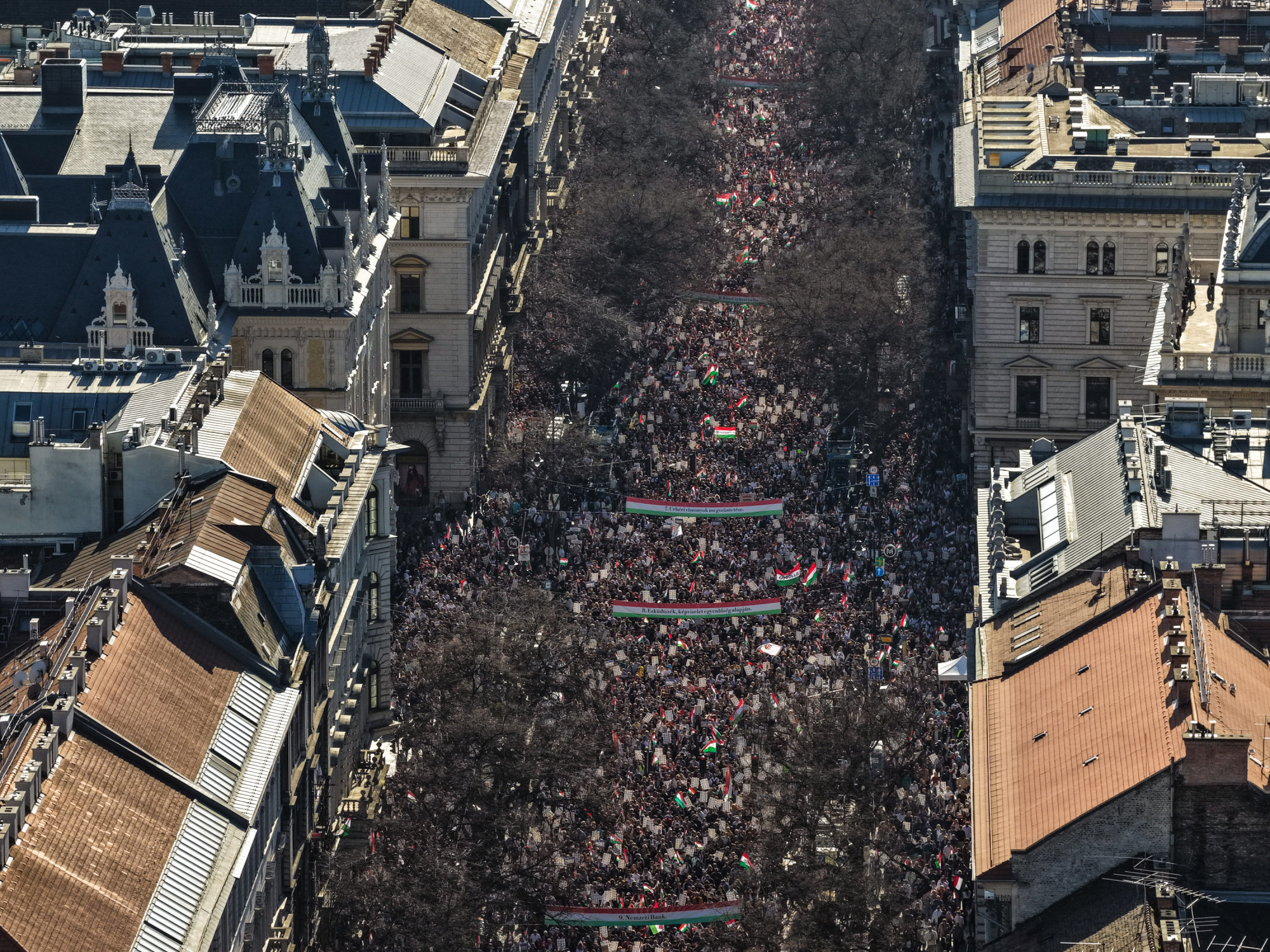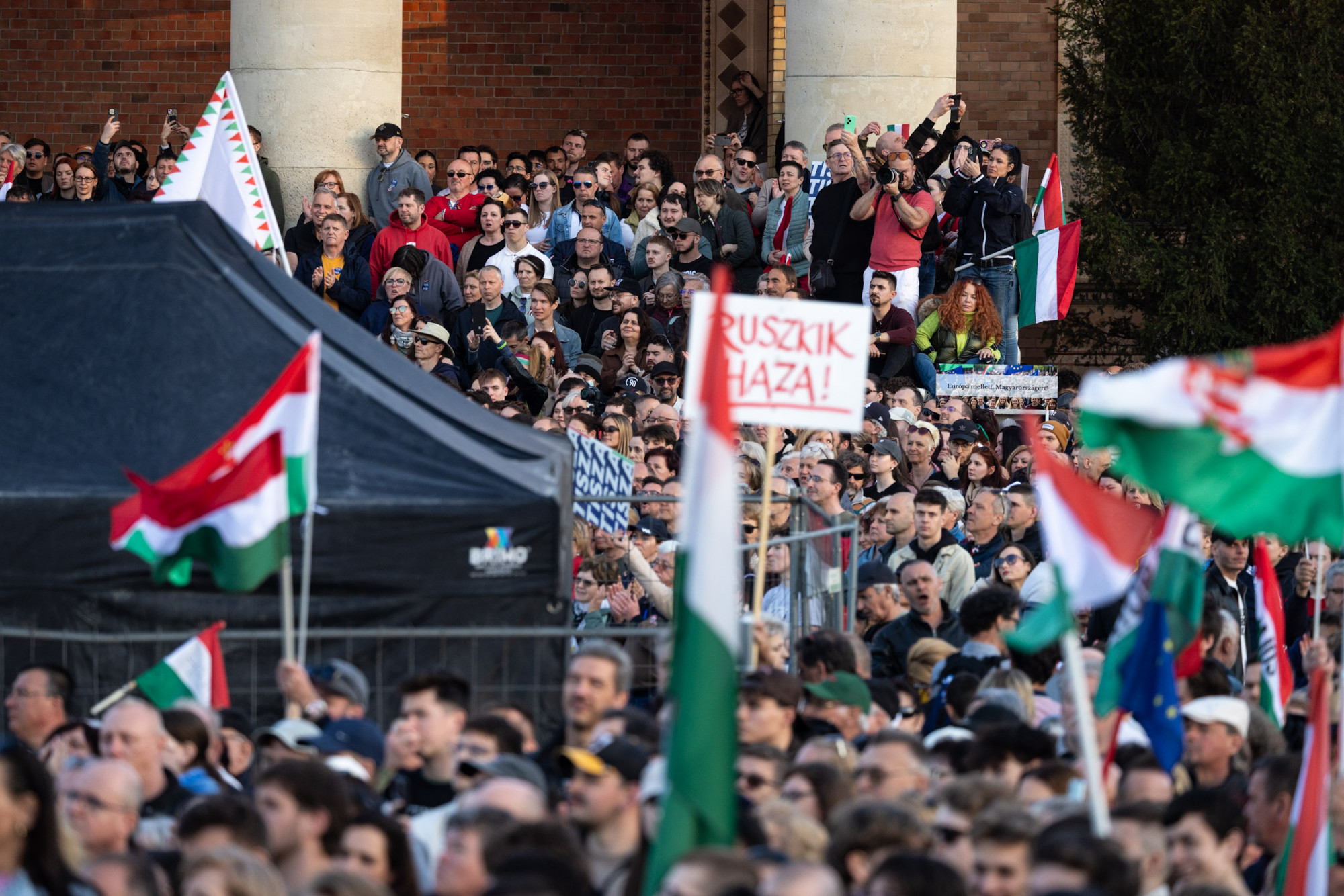 Az is szokatlan volt, hogy a menetben nem harsogott a „mocskos Fidesz”, néhány próbálkozás volt erre egyes helyeken, de azok gyorsan elhaltak. Mást sem nagyon skandált a tömeg, a „ruszkik haza” jött be leginkább, arra még a Hősök terétől távol, a Kodály köröndön is vevők voltak, ahogy Magyar esküjét is megtapsolták. (A Tisza elnökének beszédét ebben a cikkünkben foglaltuk össze.)