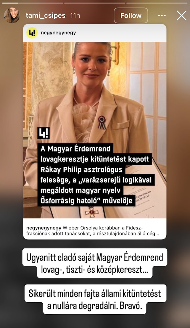 „Sikerült mindenfajta állami kitüntetést a nullára degradálni. Ugyanitt eladó saját Magyar Érdemrend lovag-, tiszti- és középkereszt... – írta az Instagramra Csipes Tamara kétszeres olimpiai, kilencszeres világ- és tízszeres Európa-bajnok magyar kajakozó. Ahogy a Blikk is megírta, tette mindezt a 444 posztját kommentálva, íme: