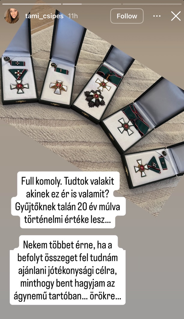 Csipes később egy újabb posztot tett közzé a Wieber-kitüntetés kapcsán, megmutatva saját elismeréseit, azzal, hogy: „Full komoly. Tudtok valakit, akinek ez ér valamit?”