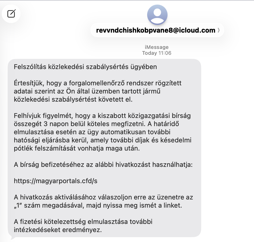Egyik olvasónk például arról kapott SMS-t, hogy közlekedési szabályt sértett, amelynek bírságát három napon belül kell megfizetnie, különben további díjakra és pótdíjakra számíthat. Ha ez még nem lenne elég ijesztő, az üzenet végén az is szerepel, hogy „a fizetési kötelezettség elmulasztása további intézkedéseket eredményez”.