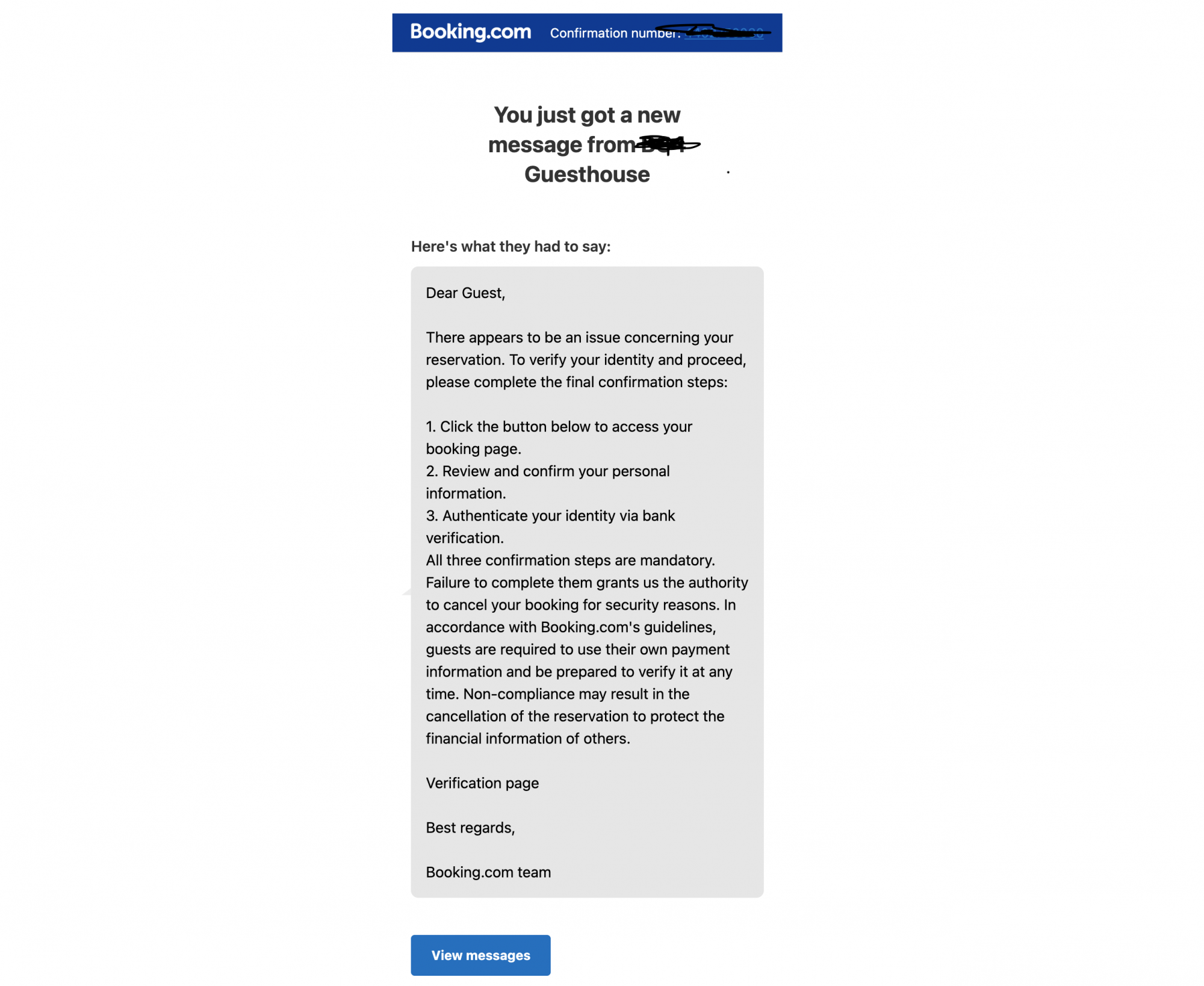 Van, aki csak azt kapta meg üzenetként a Bookingon keresztül, hogy „ahhoz, hogy a foglalása aktív maradjon, rendszerük rövid vendégadat-ellenőrzést kér”. Az üzenethez pedig egy gyanús link társult. Ezt követte a szokásos beijesztő szöveg: ha 12 órán belül nem erősíti meg a foglalását, törlik azt.