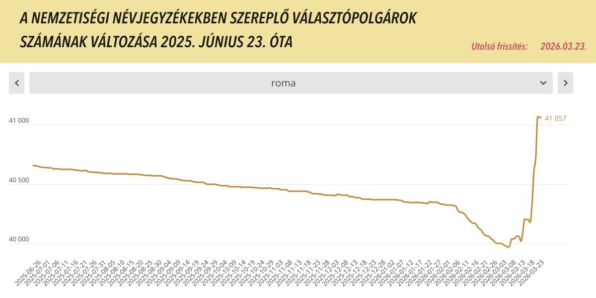 „Tavaly június 23-ától bő fél évig csak a természetes fogyás volt kiolvasható a roma nemzetiségi listára feliratkozottak lassú csökkenéséből, az értesítők idén februári kézhezvételét követően pedig néhány százan le is iratkoztak. Március 6-án indult el a görbe felfelé, 18-ától pedig egyenesen kilőtt, ma 41057-nél tart” – írja a Political Capital, amely 9 hónapja napi szinte monitorozza a nemzetiségi névjegyzékek mozgásait.