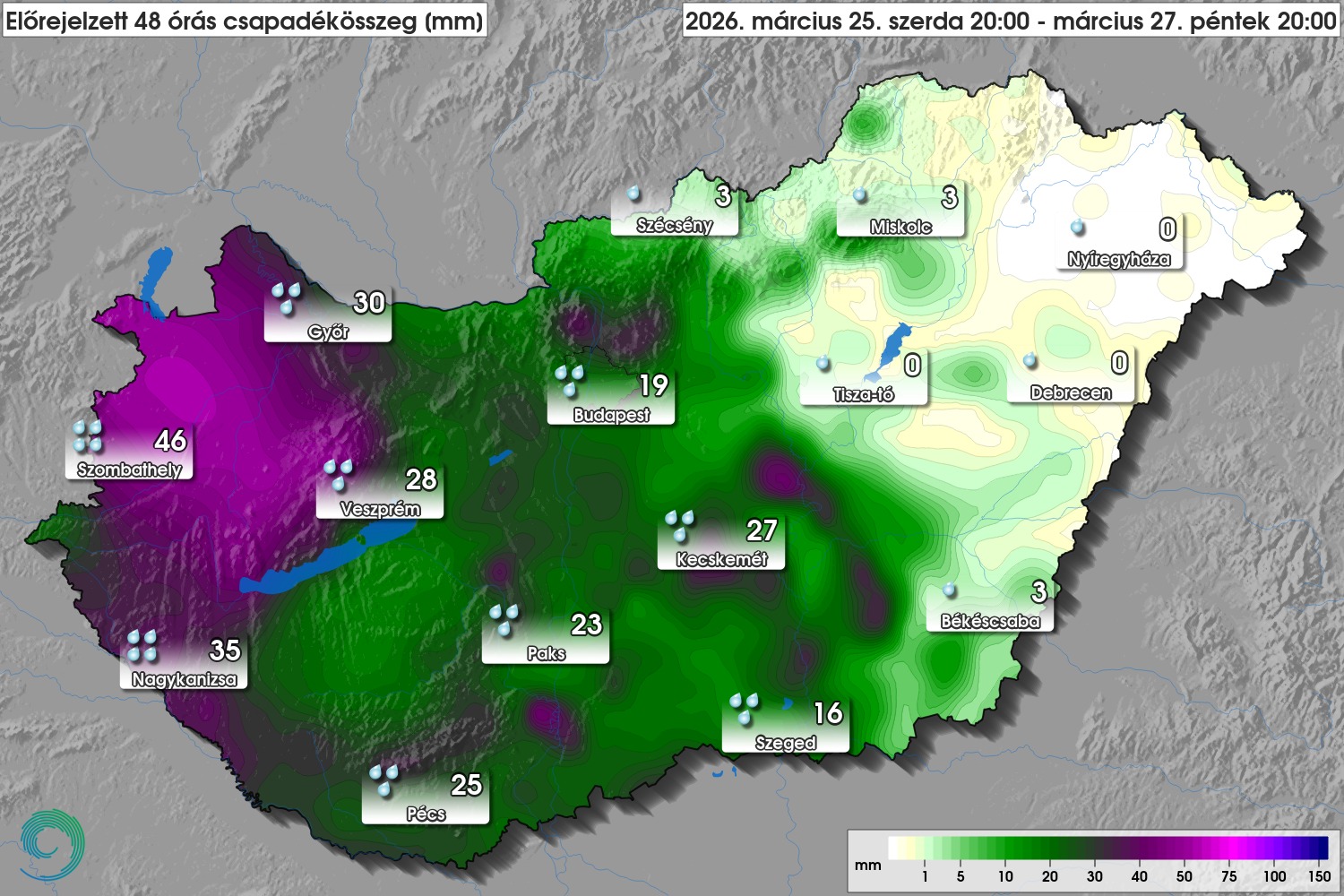 Az időjárás előrejelzés szerint nyugaton szerda estétől péntek estig sok helyen 30 milliméternél is több eső eshet. Keleten ehhez képest visszafogottabban alakul az idő, bár csütörtök délután elszórtan zivatar is várható.
