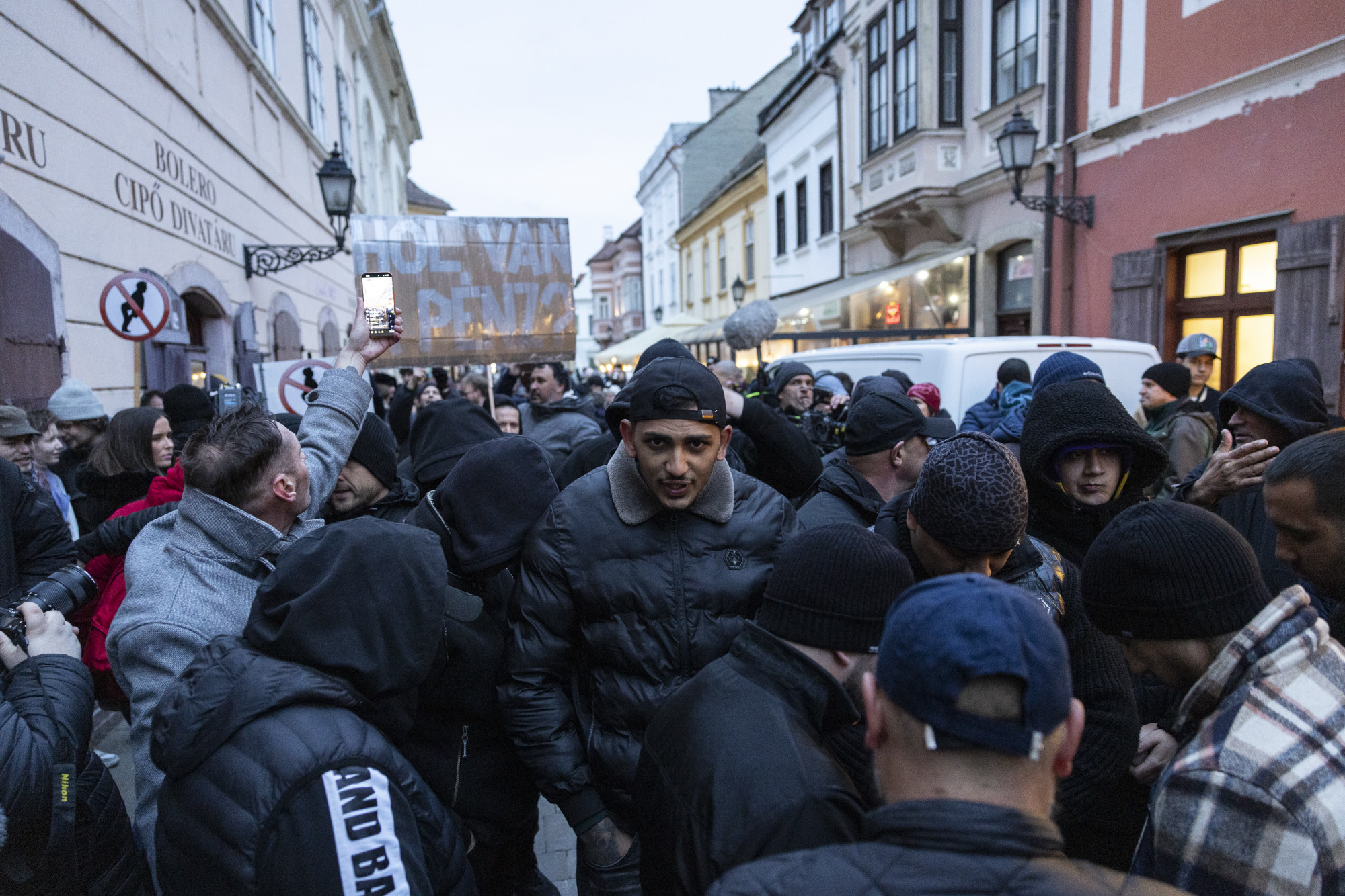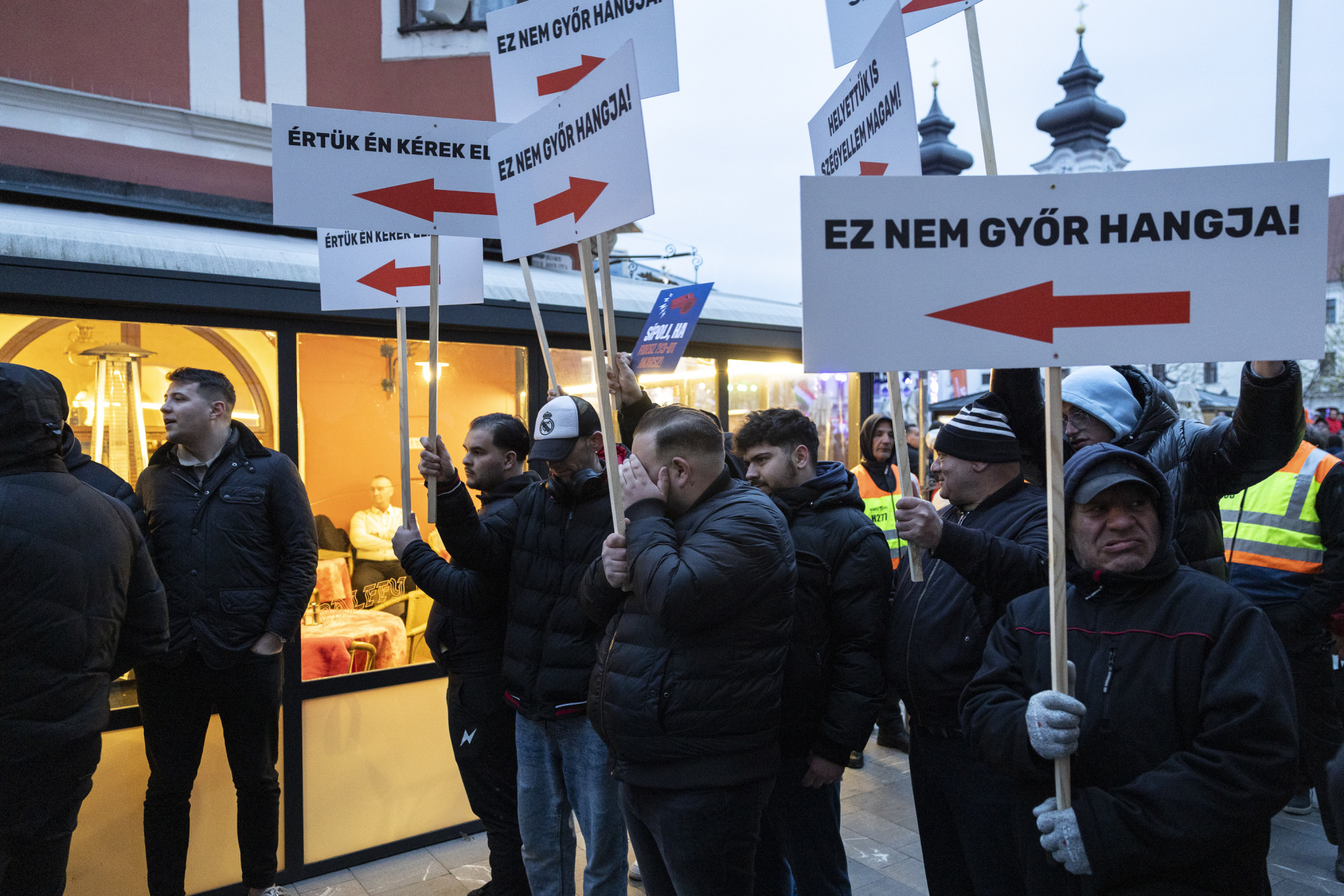Fekete ruhás, marcona alakok gyülekeznek 6 óra körül a Jedlik Ányos és a Király utca sarkán Győrben. Nagy tér sarka ez a két utca, ott beszél majd Orbán Viktor és a külügyminisztere valamivel később. Akik itt gyülekeznek, nem fogják hallani a beszédeket. Elnyomja majd a sípolás és az ordítozás.