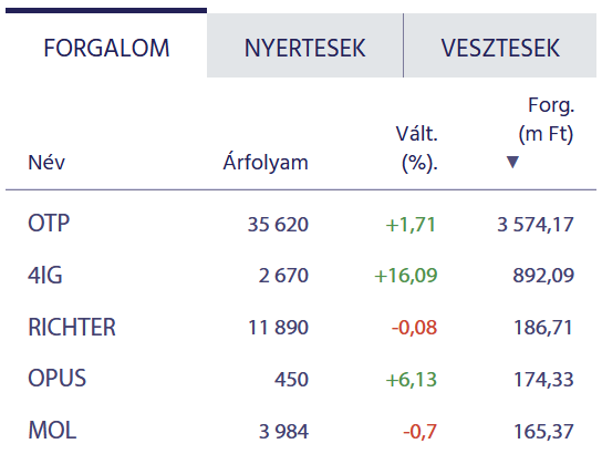Mindeközben viszont az elmúlt napok nagy NER-es vesztesei közül kettő jelentős forgalomban komoly erősödést mutat. A 4iG több mint 16 százalékos erősödéssel a múlt szerdai árfolyamára drágult vissza, igaz, ebben egy jelentős értéknövelő bejelentésnek, a Hirtenberger Defence Systems Kft. 49 százalékos üzletrésze értékesítésére irányuló adásvételi szerződés megkötéséről szóló tájékoztatásnak is szerepe volt. A másik jelentősen és nagy forgalomban dráguló részvény az Opus, ami 6 százalékos pluszban van, ezzel szintén a múlt hét közepi árfolyamára erősödött vissza.