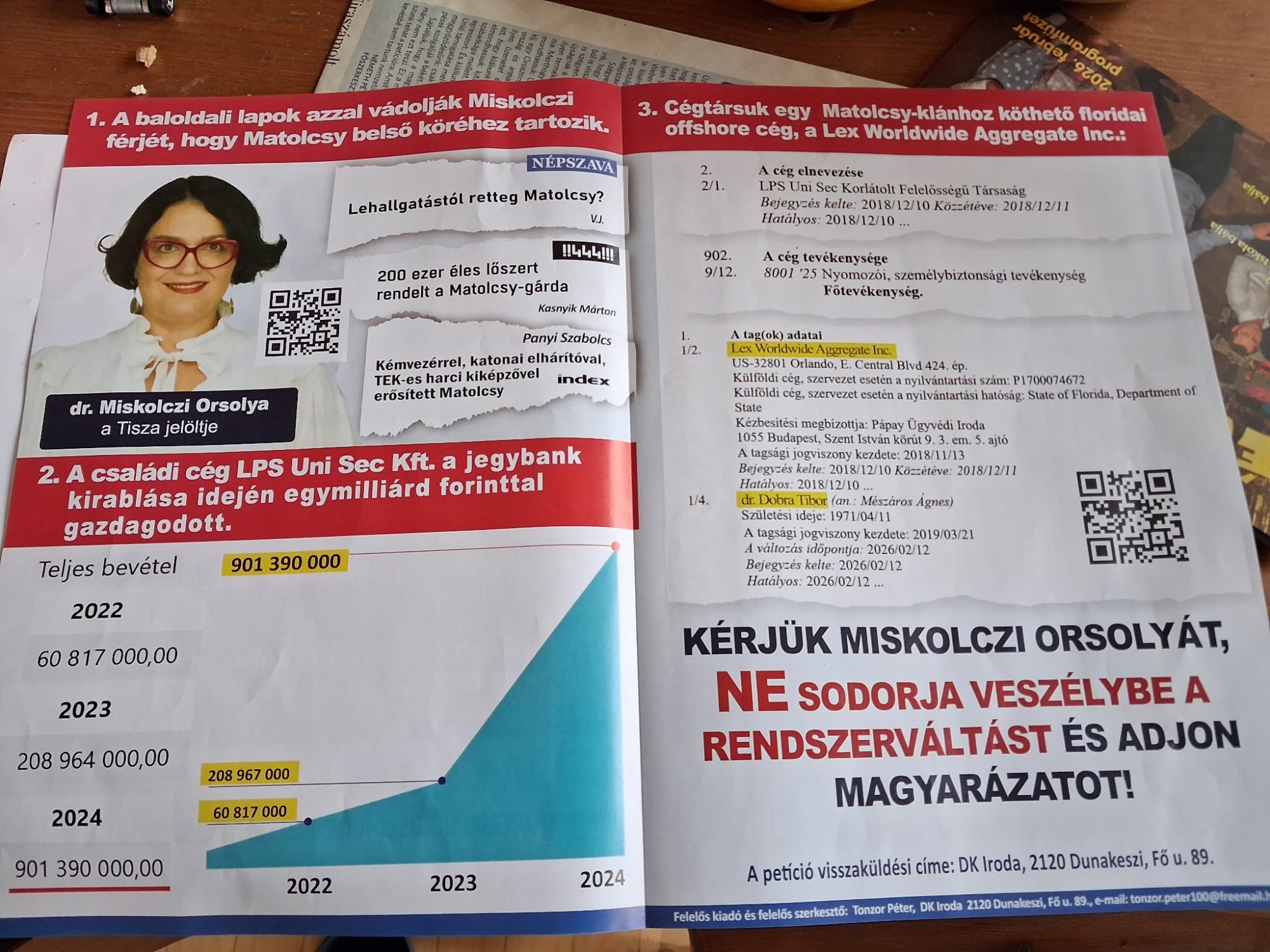 A négyoldalas, jó minőségű, nehéz, drága papírra nyomtatott brosúra egyetlen témával foglalkozik: Miskolczi Orsolya tiszás jelölt férjével, Dobra Tiborral, illetve az ő cége és a Magyar Nemzeti Bank, illetve Matolcsy György kapcsolatával. Klasszikus, lejárató szándékú kampányanyag, de egy jelentős csavarral: nem a kormánypárt adta ki, hanem - az impresszum szerint legalábbis - a DK. Vagyis egy másik ellenzéki párt támadja a Tiszát.