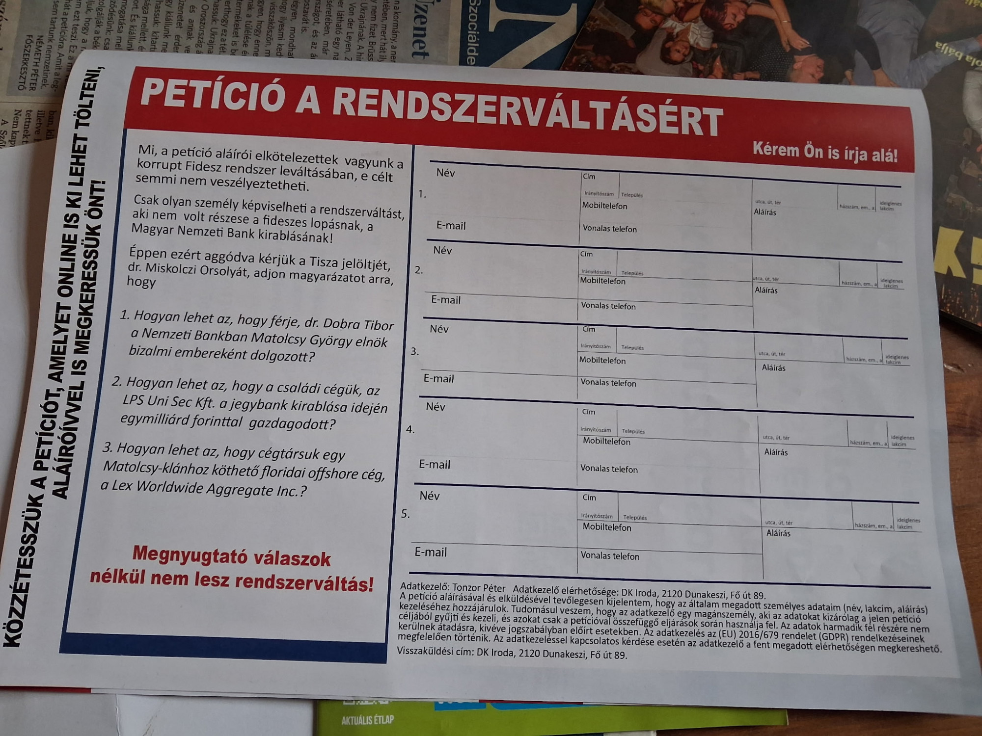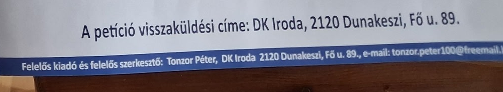 És aki a mostani országgyűlési választáson DK-s egyéni képviselőjelöltként is indul, de nem itt, Pest megyében, hanem a Hajdú-Bihar megyei 4. OEVK-ban. A kiadó címeként pedig a DK Dunakeszi, Fő utca 89. szám alatti irodájának címe van megadva. Azt a 444 kérdésére Rónai Sándor, a Pest megyei 5. OEVK DK-s képviselőjelöltje is megerősítette, hogy tényleg ez az irodájuk címe. Ennek később nagy jelentősége lesz. A brosúra végén egy petíció található, ami klasszikus adathalász kampányeszköz: aki egyetért azzal, hogy a tiszás jelölt válaszoljon néhány keresztkérdésre, az visszaküldheti a mellékelt aláíróívet. Nem máshová, mint a már említett, Rónai által is megerősített DK-s iroda címére.