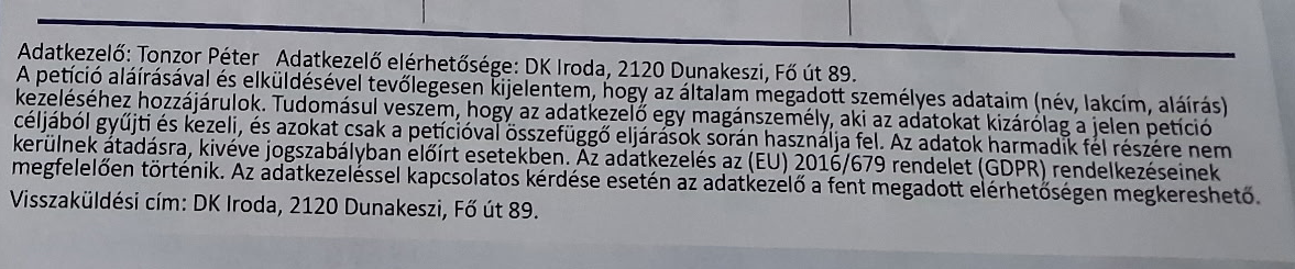 A petíción adatkezelőként is Tonzor Péter van feltüntetve. Érdekesség, hogy mint fentebb látható, magánszemélyként, hiába a DK irodájába várja az íveket.