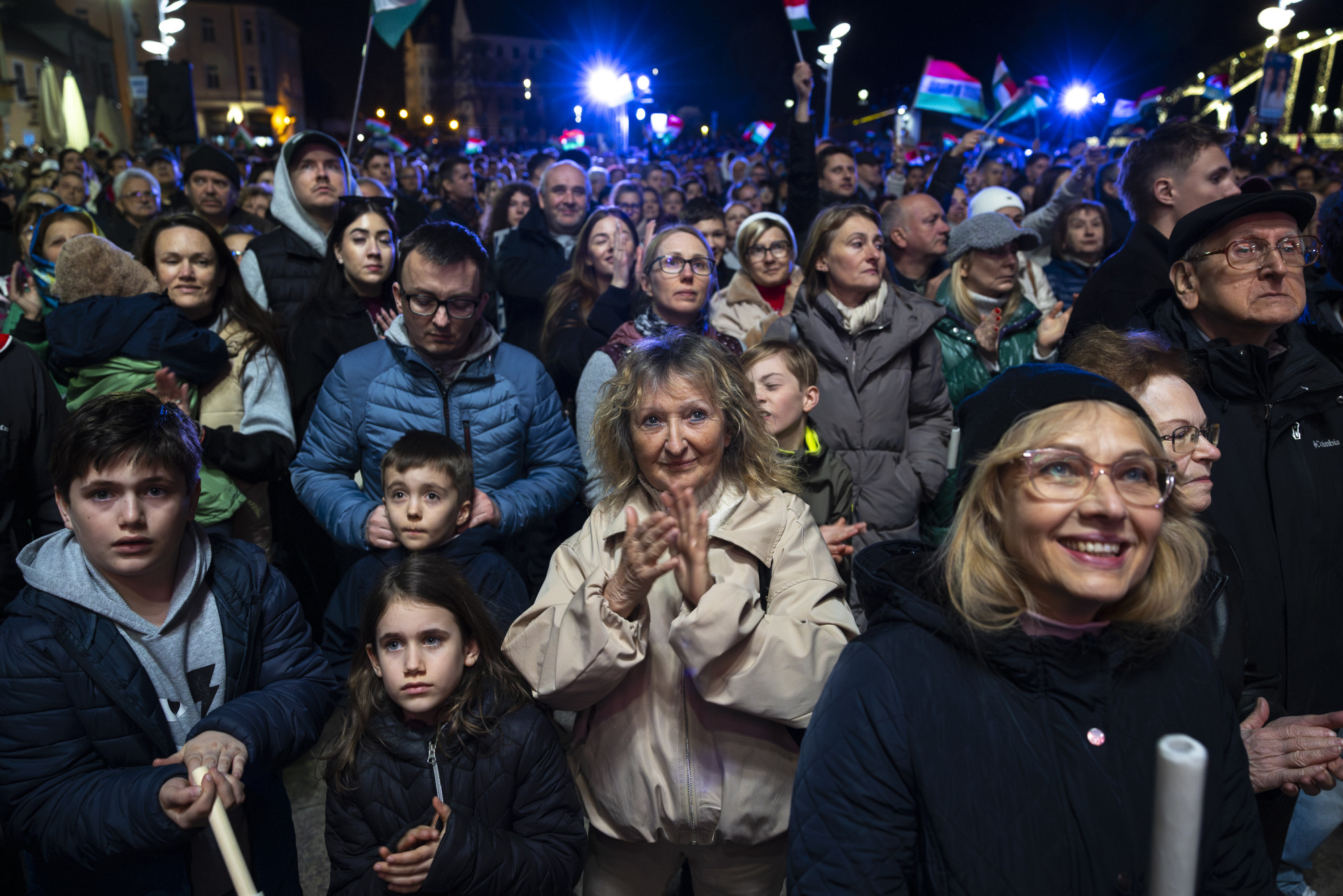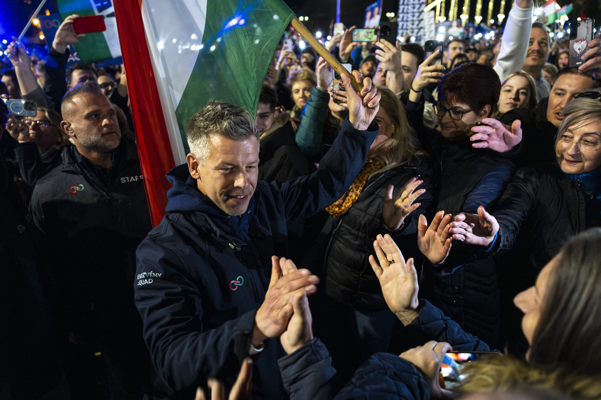 A lényeg, hogy a Tisza győzni fog, „nem kicsit, hanem nagyon”, és hogy rendszerváltás. Ezeket Magyar meggyőződéssel mondja, és ez láthatóan ráragad a tömegre.