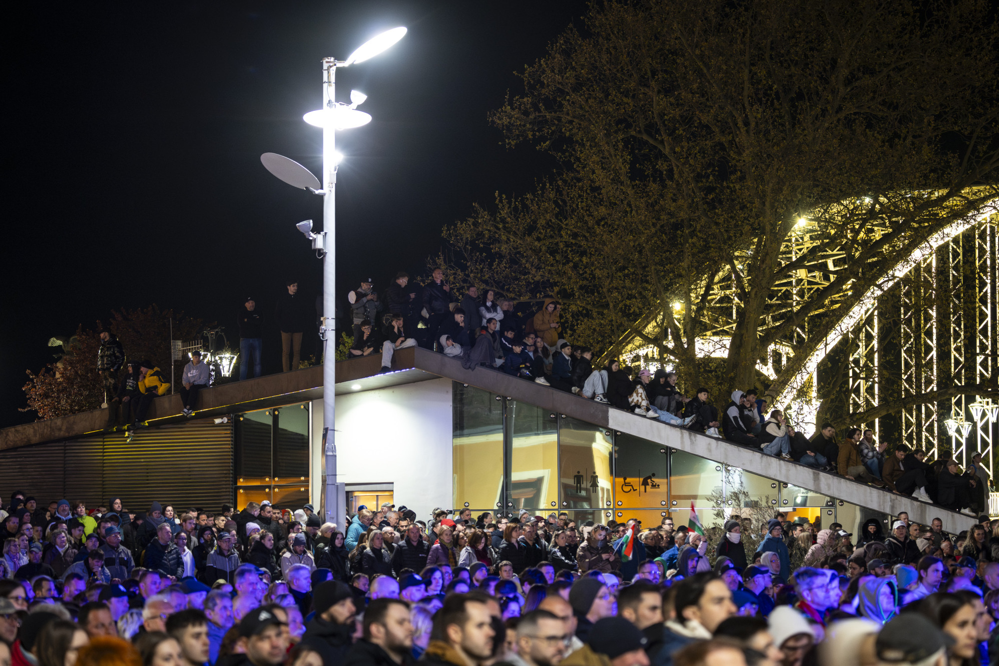 Az István a király zenéjéből tudják az egybegyűltek, hogy megjött Magyar Péter. Ujjongások, „árad a Tisza”, egy férfi zavart tacskóját tartja a magasba, miközben skandálja.