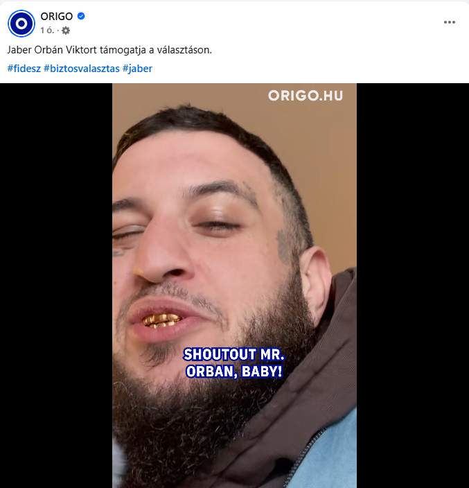 A fideszes/putyinista Origo megosztott egy méregerős, Orbán Viktor melletti kiállást Jabertől, a drogokról és fegyverekről rappelő, aranyfogú kuvaiti–magyar rappertől, aki a magyar nyelvet amerikai rapperszlenggel keverve csatlakozott a fizetett állampáti celebek táborához: