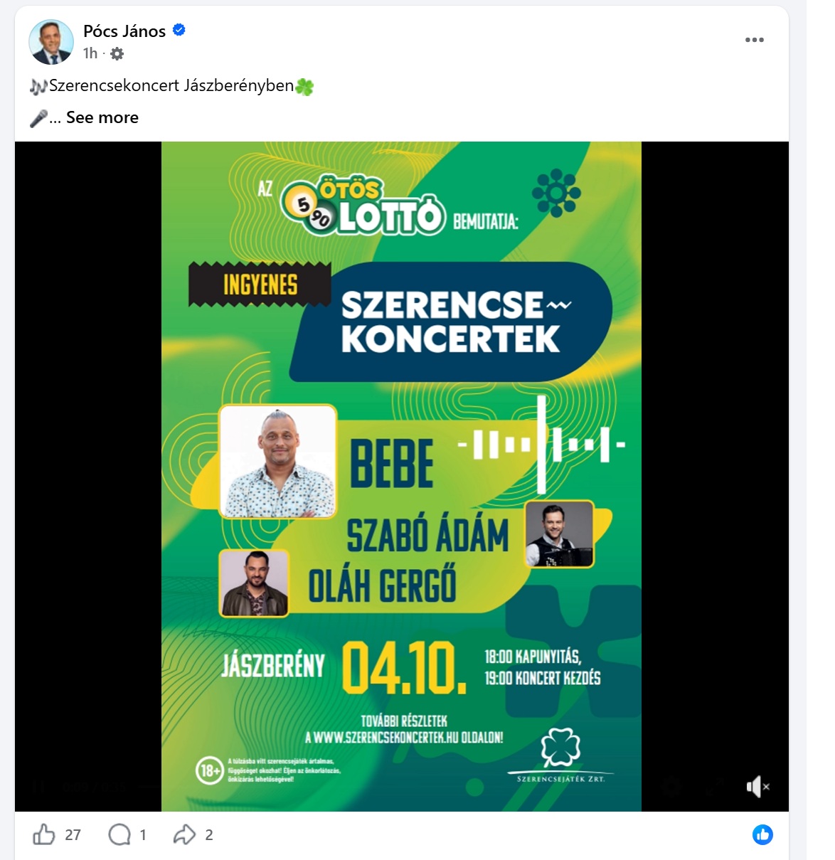 A választásokig lesz Szerencsekoncert Szekszárdon, Kapuváron, Püspökladányban, Nyíregyházán, Esztergomban, Csornán, Zagyvarékason, Győrben, Szombathelyen, Szarvason, Máriapócson és Jászberényben is. A rendezvényeken a fideszes képviselők előszeretettel fényképezkednek az előadókkal, hiszen ingyen kampányzárónak is ideálisak. A pénteki jászberényi bulit Pócs János is örömmel hirdette meg az oldalán: