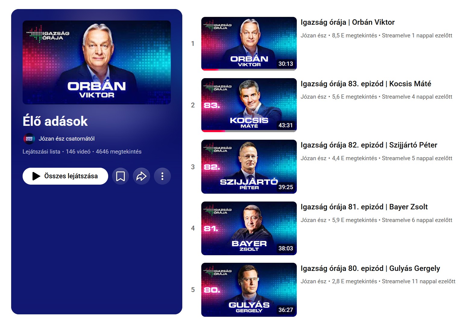 Novemberben kénytelenek voltak rebrandingelni is, hirtelen Józan Ész lett a csatorna neve, a műsort pedig egy idő után átnevezték Igazság órájára - de az igazságot nyomokban is alig tartalmazó beszélgetések azért továbbra is ugyanabból a megszólalói körből kerültek ki, Szijjártó Pétertől Kocsis Mátéig, Bayer Zsolttól Takács Péterig, különösen nehéz órákban pedig maga Orbán Viktor volt a meghívott vendég.